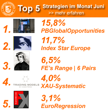 Im Juni haben unsere derzeit 16 zertifizierten Anlagestrategien eine sehr gute Leistung gezeigt. Die Top 5 Strategien im Juni, hatten zusammen im Schnitt eine Performance von 8,2%. Von allen 16 Strategien waren 12 und damit 75% profitabel. Alle 16 Strategien hatten eine durchnittliche Performance von 2,7% – bemerkenswert, wenn man bedenkt, dass im Vergleich dazu im Juni der DAX 4,66% verloren hat.