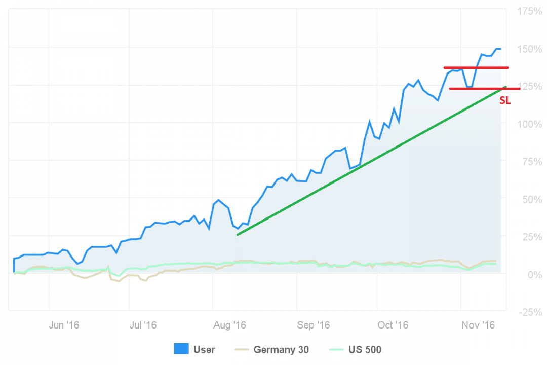 Sorry, der Blogserver spinnt ab und an. Werde versuchen, die technischen Probleme zu lösen. Zum Thema: ich hatte in den letzten Jahren mehrfach Profile vorgestellt, die in den ersten Monaten ähnlich gut liefen, wie OMPTrading. Als visuelles Hilfsmittel schlug ich vor, den Performancechart mit simplen Trendlinien zu versehen und einen virtuellen Stop zu setzen. Ich erntete damals nicht nur Zustimmung. In der Nachbetrachtung war das aber hilfreich, denn kein einziges dieser anfangs sehr erfolgreichen Profile ist noch auf ayondo aktiv. Bei OMP fehlt einfach die Historie, deshalb diese Maßnahme.