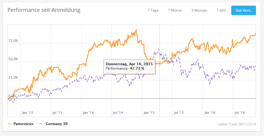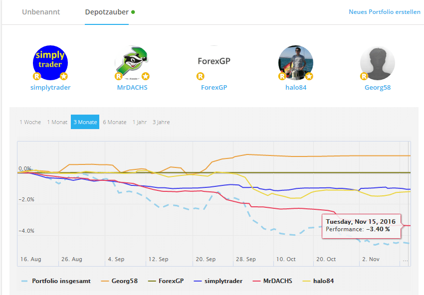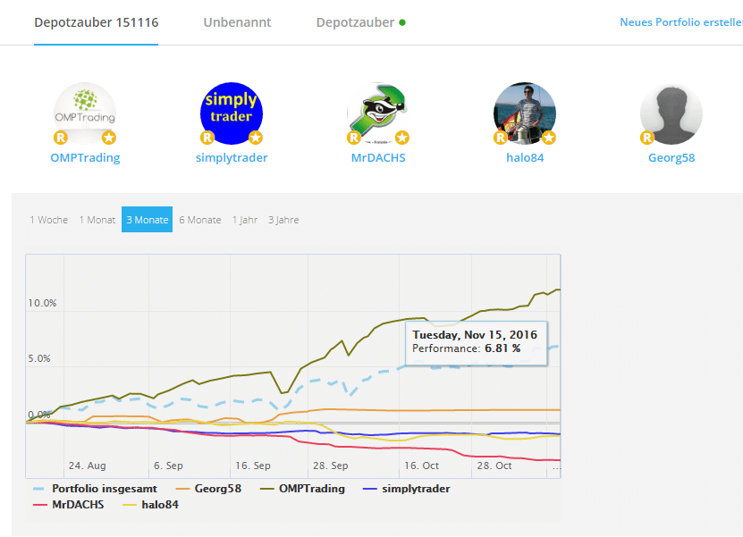 Beide agieren für mich persönlich nachvollziehbar und transparent. Die Strategie von simplytrader ist nach meinen Erhebungen robust und profitabel und wird dies auch wieder unter Beweis stellen können. MrDACHS verfolgt einen anderen Ansatz. Ein Blick in die Charts der Handelsplattform TradeHub offenbart eine überlegte Stop- und Zielsetzung der Positionen. Kritisch bleibt der Kampf um die Drawdown Marke von 25% im Traderprofil. Aber hier sage ich einmal, warten wir es ab. Stärke zeigt sich in der Krise. Das Paradebeispiel für ein erfolgreiches Comeback ist das Profil von patternicus. Der Methusalem auf der Plattform zeigt eindrucksvoll, wie erfolgreiche Stressbewältigung aussieht. Auch patternicus rang mit der Knock Out Grenze von 25% und meldete sich eindrucksvoll seit seinem Tief im Frühjahr 2015 zurück. Die mehr als 500 treuen Follower konnten von dem Erstarken profitieren und können sich nicht nur über ein neues Jahreshoch, sondern in Kürze sicher auch über ein neues Allzeithoch freuen. Leider verbieten mir die gesetzten Depotregeln für Depotzauber die Aufnahme des Profils. Der Grund – Demoprofil.