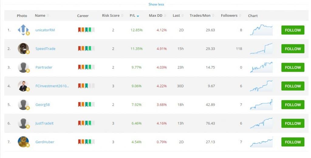 Nach diesen Kriterien verblieben 7 Top Trader. Hier legte ich nun Wert auf etwas Diversifizierung im Depot und suchte einen Forexhändler.