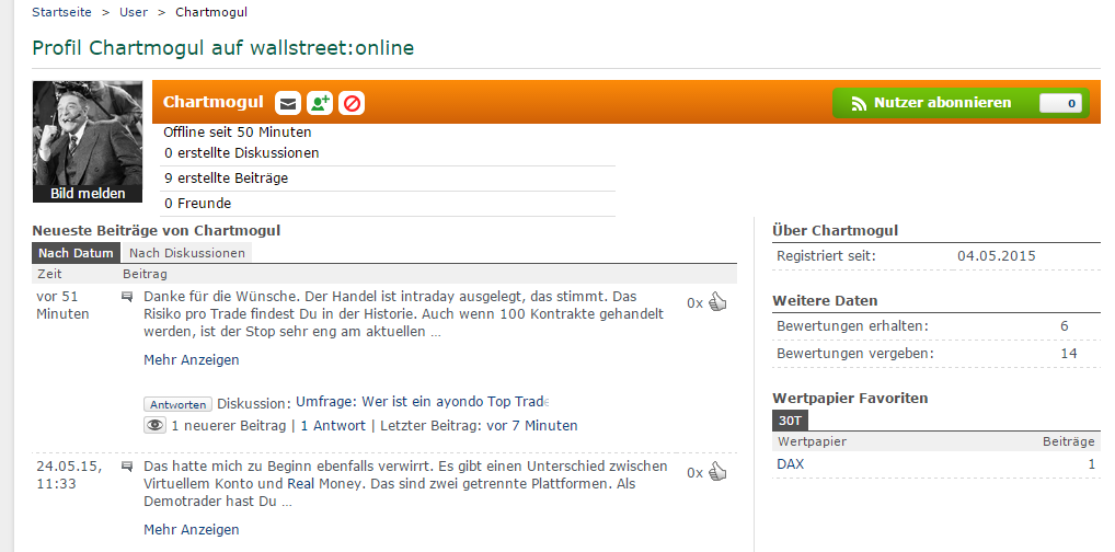 Dieses Tradingprofil bleibt auf meiner Watchlist und wird bei weiterhin einigermaßen konstantem Trading den Weg in das Blogdepot finden. Mehr zu den Intentionen des Traders hinter dem Profil Chartmogul findet man auch in seinem Blog bei tradimo und in der Diskussion bei wallstreet:online.de
