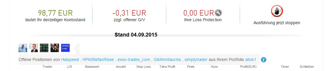 Der im Depot enthaltene Riße ist wieder ins 3. Level abgestuft worden, während Feinstaub Research weiterhin an der Pulverisierung seiner Follower-Konten arbeitet. Bei solcherlei Expertise fühle ich mich nicht zu eingeschüchtert, um nicht auch mal ein Profil bei Ayondo unters Volk zu bringen.