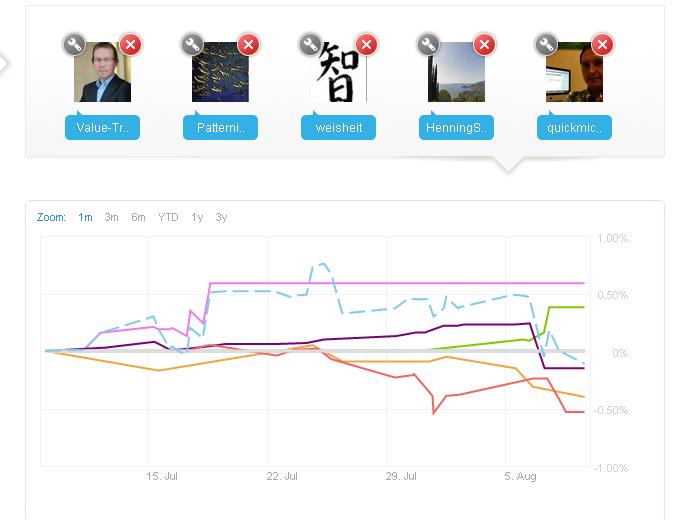 Um die Kontinuität zu wahren, belasse ich ValueTrading im Depot, reduziere aber die Gewichtung auf das Einfache. (Bisher 1,5). Patternicus und vor allem weisheit geben bisher keinen Anlass zur Klage und werden dem Depot sicher auch zukünftig helfen, eine vernünftige Performance zu erzielen.
