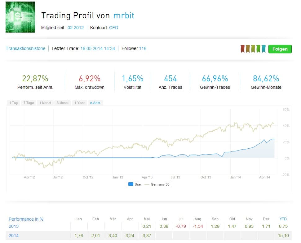 Aktuell vertrauen 116 Follower mrbit, der mit einer YTD-Performance von 15,1 % überzeugt. Vola und Drawdown sprechen für den Trader, der bevorzugt im Dax unterwegs ist.