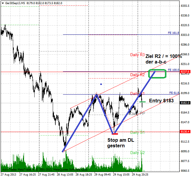 Handelsidee des Dax -Long ist eigentlich die Ausschöpfung der a-b-c- Korrektur mit Ziel R2 bei Stop unter dem gestrigen Tagestief. Heute ist Freitag und Monatsultimo. Ich setze auf einen Drive der Amis auf 15.000 und einer Fortsetzung der Bearflag im Dax. Der Markt wird entscheiden, ob der Stop geholt wird.