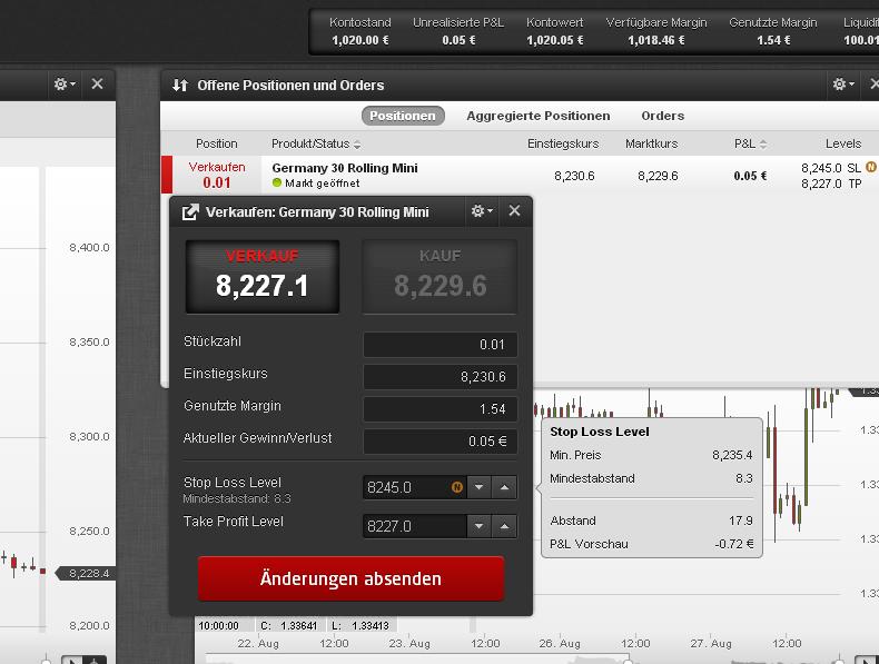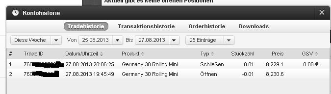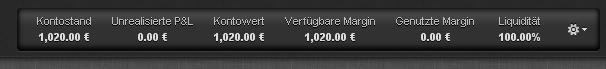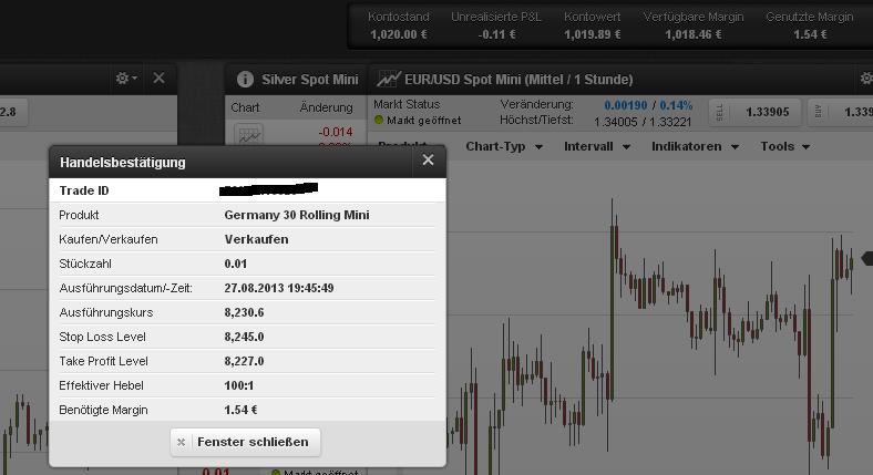 Nun heißt es, mal einen Testtrade absetzen. Im aktuellen Beispiel wurde eine Position Dax-CFD’s verkauft. Der Wert einer Einheit des DAX-CFD beträgt 5 Euro je Punkt. Um nun ein 1.000 Euro-Konto mit einem 100.000 Euro vergleichbar zu machen, wurde 1/100 des CFD verkauft. Also Punktwert 5 Cent, anstatt 5 Euro. Im Demokonto wären 5 Dax CFD mit einem Punktwert von 1 Euro gehandelt worden.