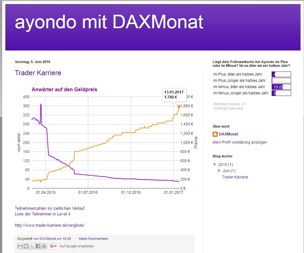 Die ayondo Social Trading Meisterschaft endet in 44 Tagen. Den Teilnehmern verbleiben also noch 35 Handelstage, um einen Stück vom Prämienkuchen zu ergattern. Im Blog von DAXMonat wird weiterhin akurat Buch geführt und den Teilnehmern damit ein brandaktueller Ausblick gegeben.