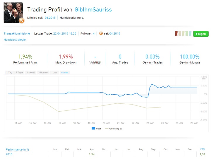 Mit knapp 2% in den letzten Tagen schlägt sich das Webinardepot sehr tapfer und wird natürlich als Real Money Depot geführt. Wer die Entwicklung im Depot und die geplanten Transaktionen verfolgen möchte, sollte sich den Account auf seine Watchlist ziehen und sich natürlich auch einmal mittwochs 18 Uhr eine Stunde Zeit nehmen und teilnehmen. Das nächste Webinar folgt am 29.04.2015 18 Uhr. Die Aufzeichnungen gibt es bei youtube.