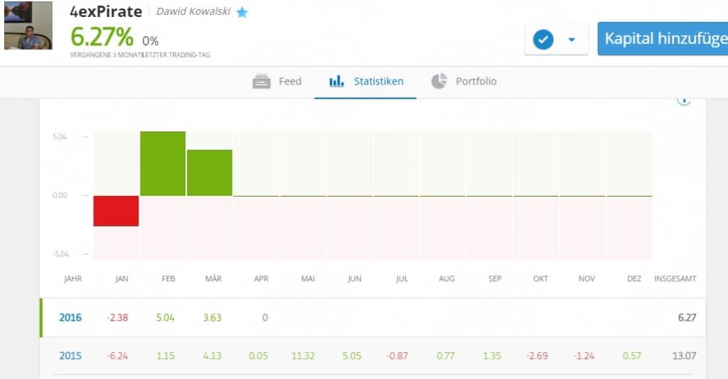 Bei den grünen Bullen sieht es insgesamt etwas entspannter aus, wenngleich ich unter den beliebten Investoren keinen ausmachen kann, für den ich mich begeistern könnte. Unser deutscher Trader aus Leipzig hatte nach einer familiär bedingten Handelspause nun auch wieder ins Geschehen eingegriffen. Er konnte also in den letzten Wochen kaum zur Performance beitragen. 4exPirate aus Polen hingegen bestätigt einmal wieder meine Erwartungen und ist weiterhin für mich das Maß an Beständigkeit auf eToro.