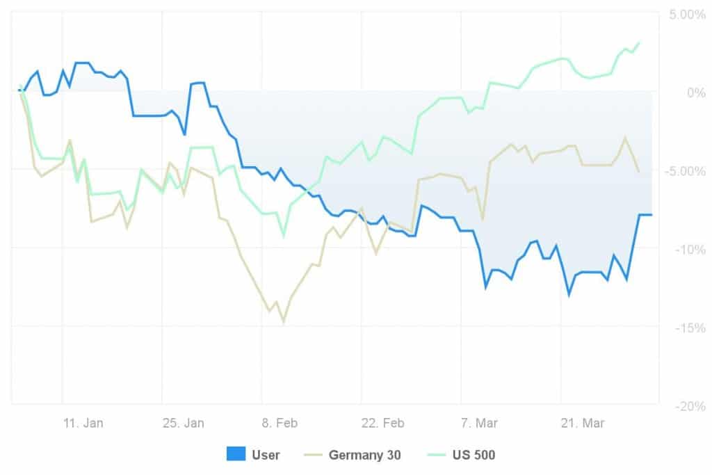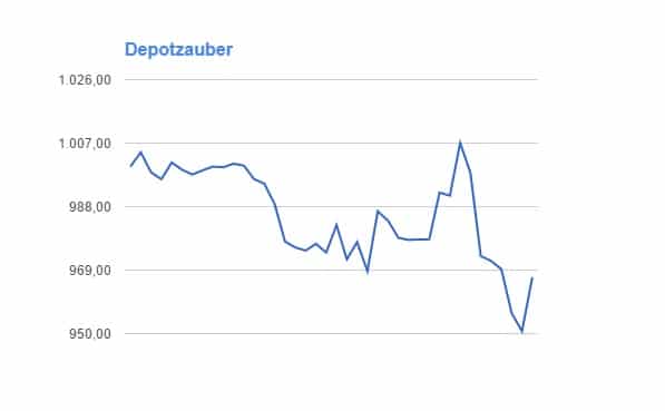 Im Ergebnis liegt Depotzauber zwar mit – 3,4 % besser als der Dax mit seinen – 8%, aber eben auch schlechter als z.B. der marktbreite S&P 500 in den USA, der sich über aktuell 1,4 % Zuwachs seit Jahreswechsel freuen kann.