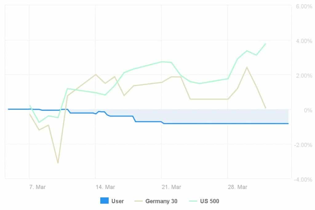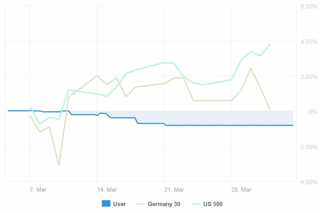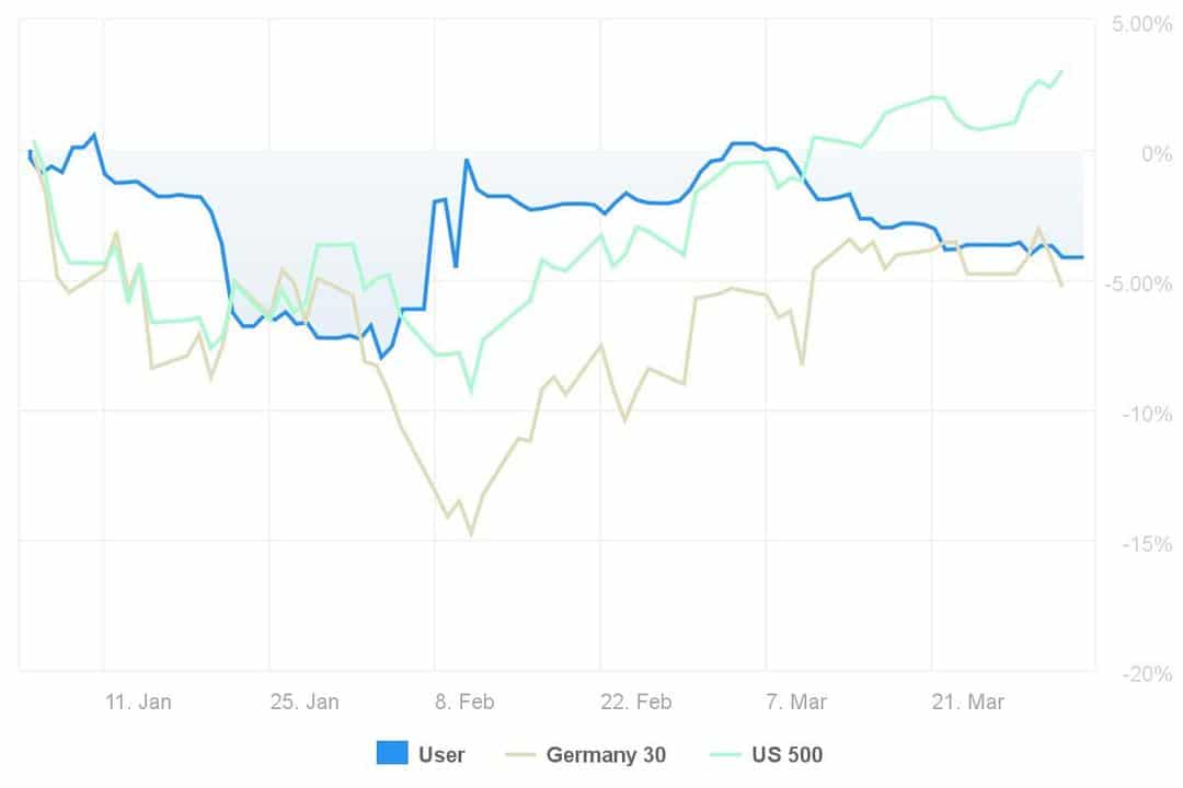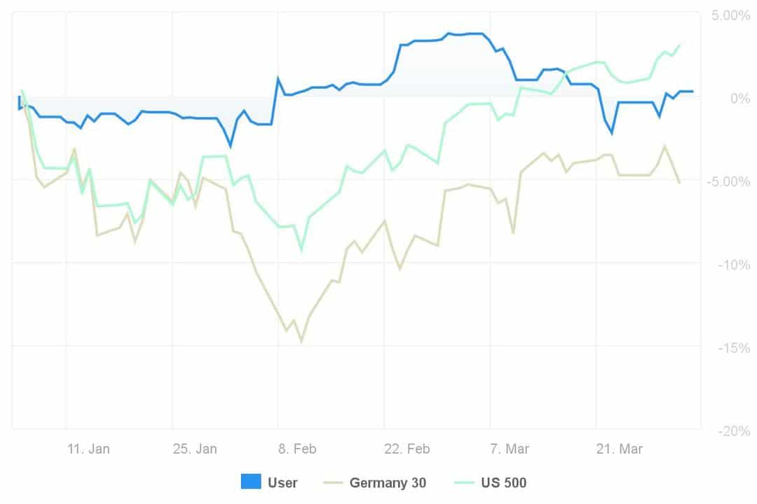 Mein Traderportfolio bei ayondo unter dem Namen Depotzauber konnte in den letzten Wochen leider nur kurzzeitig frische Luft atmen, also das Dasein mit Gewinn verbringen. Inzwischen drückt die Frühjahrsmüdigkeit der kleinen Pelzratte auch mächtig auf die Stimmung meiner Top Trader. Alles in allem ist es ihnen nicht gelungen, sich wesentlich von der Performance des deutschen Aktienindex auf die 30 Blue Chips abzusetzen. Hier macht sich nun tatsächlich die Daxlastigkeit der Trader bemerkbar.