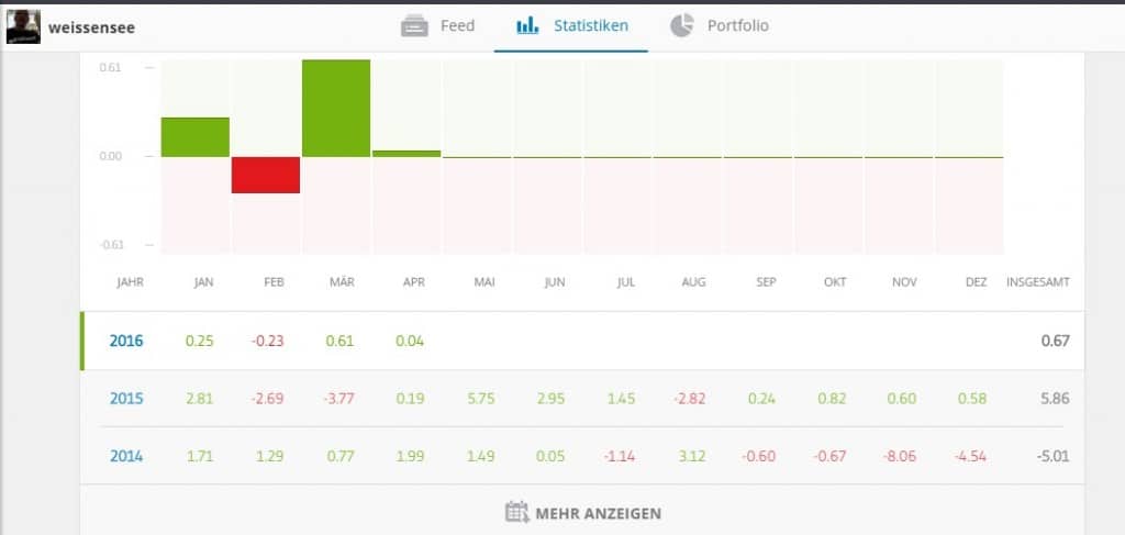 Beiden Tradern hatte ich je 100 $ zugewiesen. Bei Christian Wittig aka RunningChris steht ein kleines Minus, Bei David Kowalski hingegen ein Plus. Der Dritte im Bunde war mir nach 3 Wochen mit Gewinn durch einen Copy StopLoss gerutscht. Einige wenige Trades habe ich selbst beigetragen, so dass sich das Depot seit Jahresbeginn im sanften Plus bewegt. In den kommenden Tagen werde ich die Suche nach einem dritten Trader für das Portfolio aufnehmen, behalte aber gut 40 % des Kapitals für Selftrades.