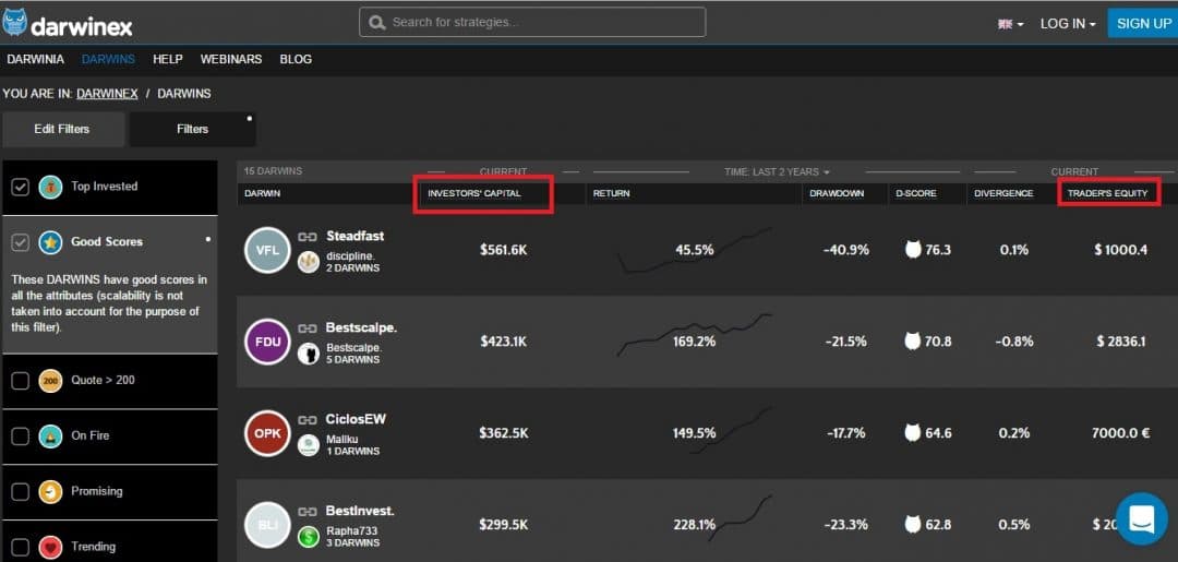 Die Mindestkontogröße für Follower ist aktuell 1.000 Euro. Im Schnitt ein Konto von 2.000 Euro. Dieses wird häufig wohl nicht auf 5 Top Trader verteilt, sondern weniger. Sagen wir also einmal 4. Also stehen von den 2.000 Euro 500 Euro je Top Trader zur Verfügung. bei 1.000 Followern sind das 500.000 Euro. Splitte man nur auf 2 zu je 1.000 Euro, landet man bei 1 Mio.