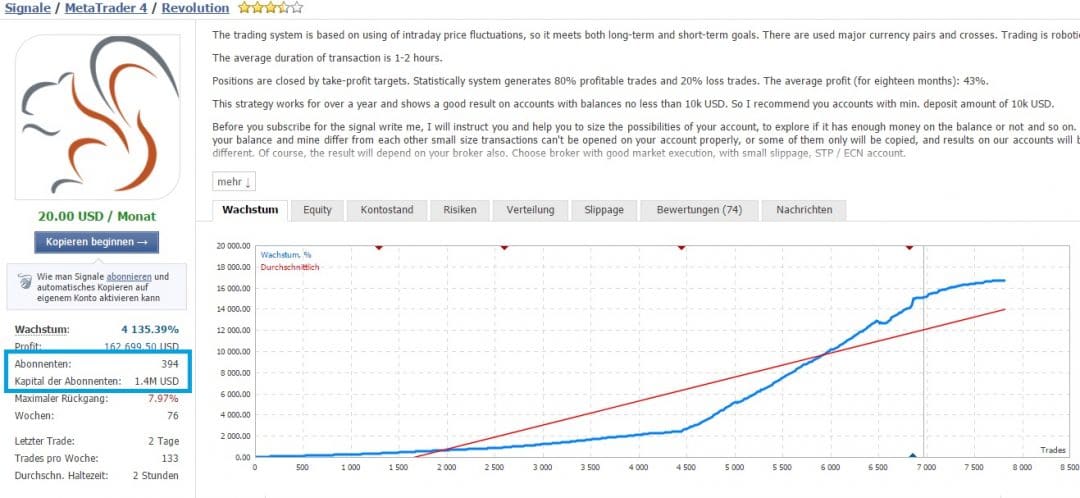 Nimmt man die Zahlen der Metatrader-Plattformen wie mql5, myfxbook, Signal Start u.ä., so hat sich an der Grundeinschätzung nicht viel geändert. Die Subscriberzahlen auf myfxbook schwanken zwischen 30 – 2.500, verteilt auf 50 Strategien, hinter denen im Grunde auch nur etwa 30 Trader stecken. Die Abonnentenzahlen auf mql5 für Metatrader 4 Strategien sind auch eher ernüchternd. Von den Bezahlabos kommen gerade einmal 4 Profile auf mehr als 200 zahlende Kunden. Von denen werden auch nicht viele glücklich werden, denn die gehandelten Strategien lassen wenig Raum für die Profitabilität der folgenden Kopierer.