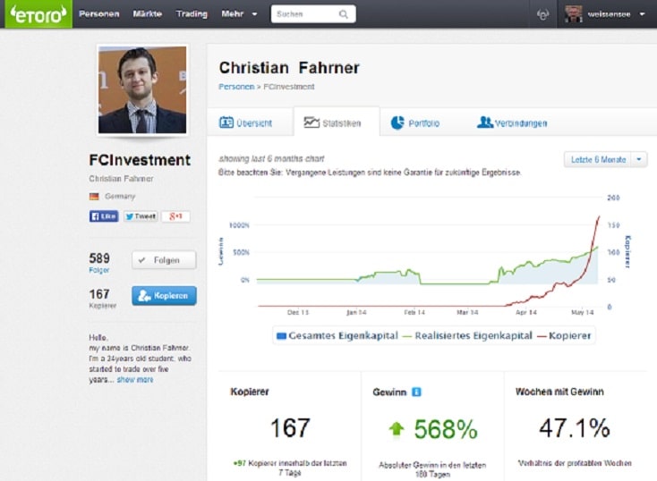 Christian Fahrner agiert seit Jahresbeginn auf eToro und legte, nach einigen Anfangsproblemen, inzwischen eine Performance von 600 % hin. Ein Blick in sein Profil lohnt sich also.