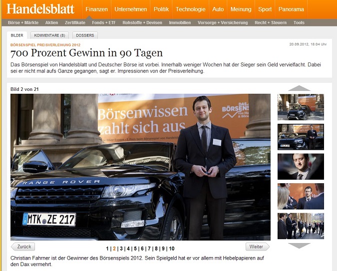 Christian Fahrner, so der Name des Händlers, gewann 2012 das Börsenspiel von Handelsblatt und Deutscher Börse und sahnte mit einer Performance von 700 % in 90 Tagen den Hauptgewinn, einen kleinen Vorstadtpanzer ab. Unter 17.000 Teilnehmer war er zum Schluss die Nr. 1. Hut ab.