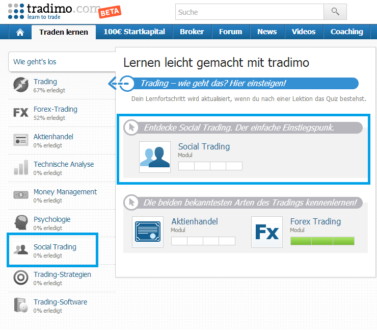 Da sich dieser Blog mit Social Trading beschäftigt freue ich mich sehr, dass tradimo zu diesem Thema eigene Lektionen entwickelt hat und diese in der Rubrik Social Trading gratis anbietet. Jede Lektion wird mit einem Quiz abgerundet, in der der User das erlernte Wissen überprüfen kann. Es finden sich hilfreiche Tipps für Follower auf Social Trading Portalen, wobei im Mittelpunkt der Lektionen natürlich der aktuelle Partner ayondo steht. Ungeachtet dessen treffen die Inhalte und Empfehlungen auch für andere Wettbewerber zu.