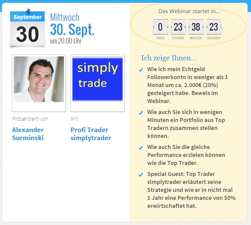 Wer morgen Abend, am 30. September ab 20 Uhr eine Stunde Zeit aufbringt, kann ihm im Webinar der Traderschmiede powered by ayondo auf den Zahn fühlen und ihm sicher auch viele Fragen zur Person, System und Erwartungen stellen.