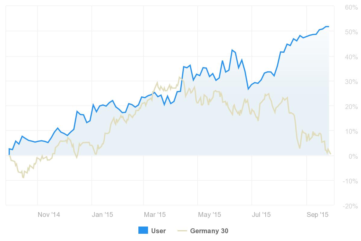 Klingt gut und ist gut. Die Performance des ayondo Top Traders im Vergleich zum Dax. Auf Jahressicht heißt es 50 % simplytrader versus 0 % Daxilein.