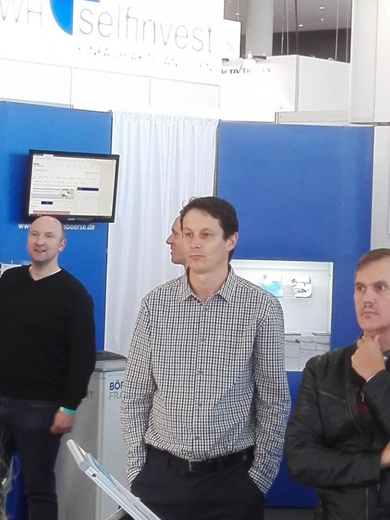 Diese Gelegenheit nahmen auch diesmal viele Besucher war und informierten sich zu den Strategien von Patternicus, MrDACHS, Volastrategie und EdleMetalle. Patternicus und MrDACHS stellten u.a. ihre Handelsstrategien DieDatenbank.de und StockMarketStarsUSA vor. Daniel Saurenz von Feingold Research stand nicht nur für Fragen zur Volastrategie zur Verfügung, sondern bereicherte das Standprogramm mit einem unterhaltsamen Vortrag zum Thema Bitcoin. Dabei war u.a. zu erfahren, dass ayondo das Universum der Handelsinstrumente um weitere CFD’s auf Kryptos erweitern wird, u.a. Ethereum, Dash, Ripple. Informationen werden sicher zeitnah auf ayondo publiziert.