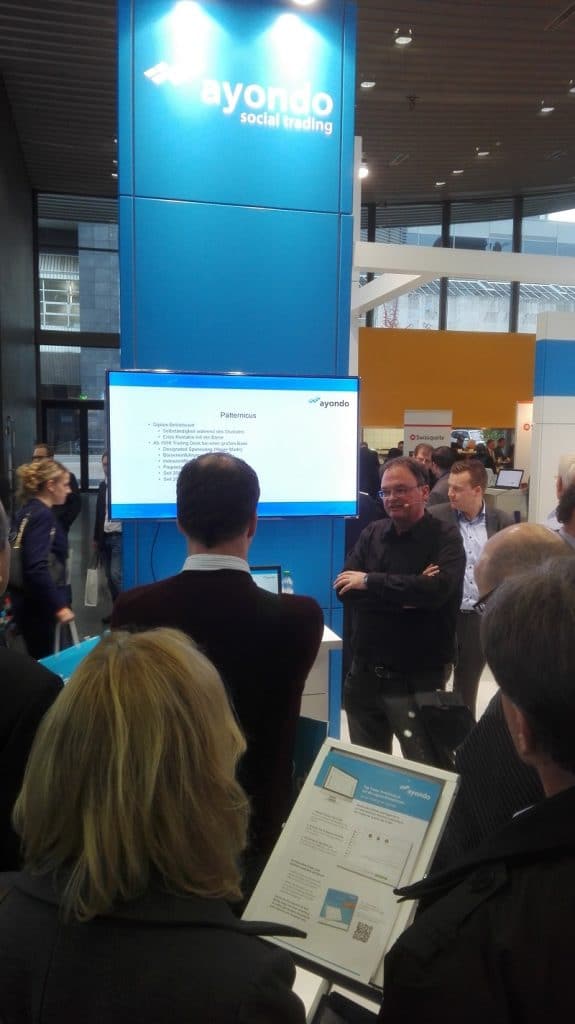 Vom Aufwind der Kryptowährungen profitieren aktuell fast alle CFD-Broker, die reihenweise nun den Handel mit CFD’s auf diese Konstrukte ermöglichen. Kurioserweise war gerade der Pionier für CFD’s auf diesem Gebiet – eToro – nicht auf der Messe vertreten. Schade eigentlich, denn so blieben einige Fragen für mich unbeantwortet. Aus Sicht des Social Trading Bloggers gab es diesmal keine Überraschungen in der Liste der Aussteller. Das Thema Social Trading und Investing hielten diesmal nur ayondo und wikifolio hoch. Bemerkenswert auch hier, das wikifolio.com diesmal ohne den Stand des Zertifikatepartners Lang & Schwarz vor Ort war. Der Stand wirkte dadurch etwas geschrumpft. Dies tat dem regen Interesses des Publikums aber keinen Abbruch. Auch dieses Jahr standen erfolgreiche Händler Rede und Antwort. Stefan Waldhauser und sein erfolgreiches wikifolio High-Tech Stock Picking fand freundlicherweise auch Berücksichtigung in der Berichterstattung von boerse.ard.de
