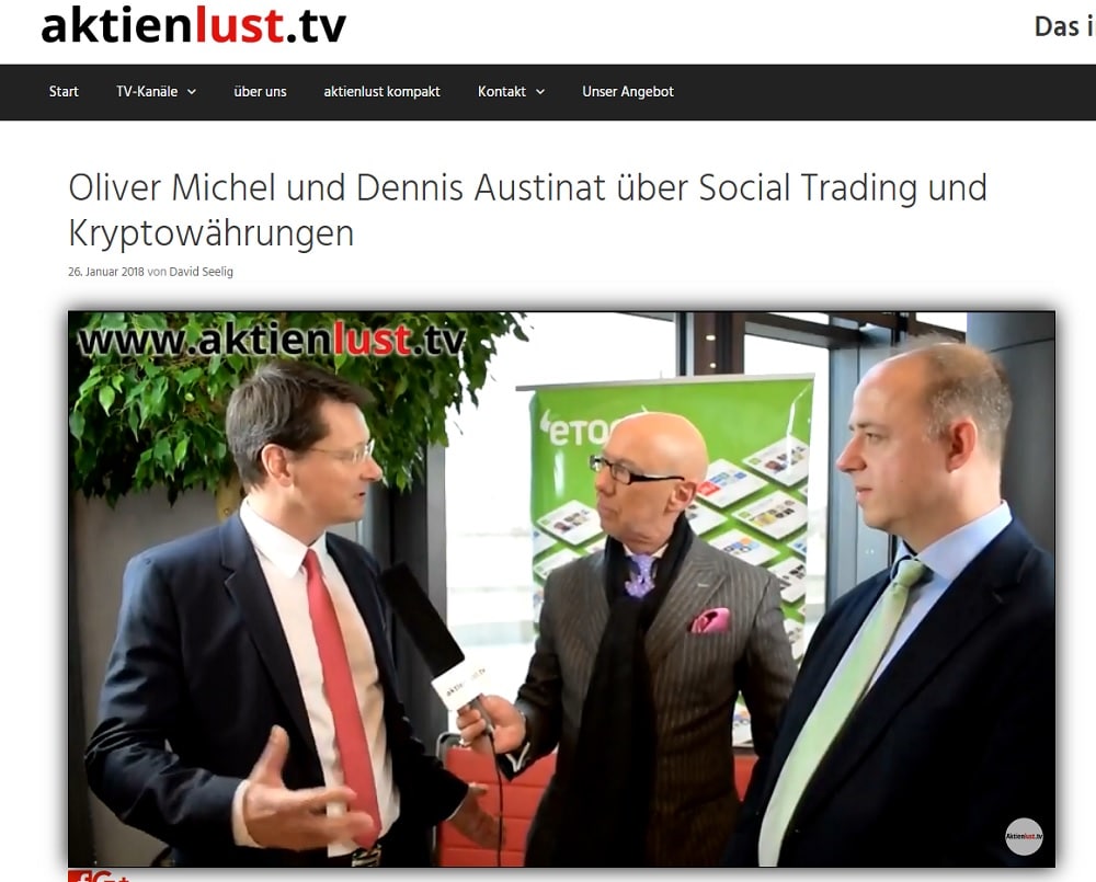 Wie bereits von mir vor einigen Tagen hier berichtet, stellt sich eToro mit dem Handel von Aktien und der Einführung einer eToro Wallet für den Kryptohandel noch breiter auf. Die Partnerschaft mit dem erfrischenden Angebot von aktienlust.tv wird wohl auch für erhöhte Aufmerksamkeit beim deutschen Publikum sorgen. In Stuttgart zur Invest gibt es jedenfalls ein Wiedersehen. Interessenten sollten sich also schon mal den und