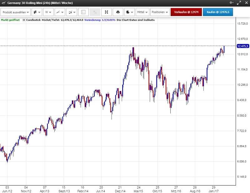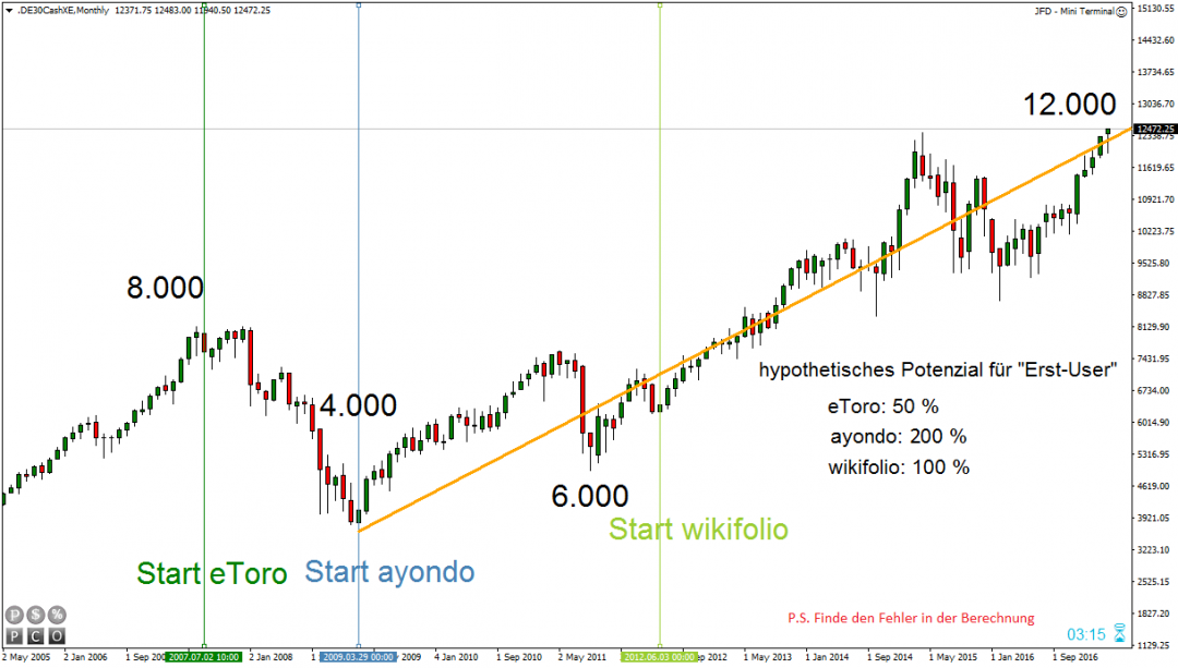 Diesen Eindruck könnte man gewinnen, wenn man sich einmal das große Chartbild der Aktienindizes zu Gemüte führt und dies mit der Performance von Handelsstrategien auf ayondo, eToro, wikifolio.com u.a. vergleicht. Bilder sagen meist mehr als Worte. Daher anlässlich des heutigen neuen ATH im deutschen Aktienindex DAX einmal ein Blick auf einen Wochenchart des Index CFD bei ayondomarkets. Eine eindrucksvolle Rally, unterbrochen von einem ca. 30 %-igen Drawdown.