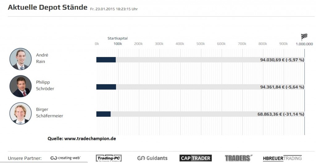 Die ersten Wochen zeigen jedoch, ganz so einfach ist es nicht, die Ziele zu erreichen. Wir haben zwar Volatilität vom Feinsten, aber so richtig profitabel wirkt es sich bisher nicht in den Teilnehmerdepots aus, leider sogar im Gegenteil., wie folgender Screenshot vom heutigen Tage von tradechampion.de verrät.