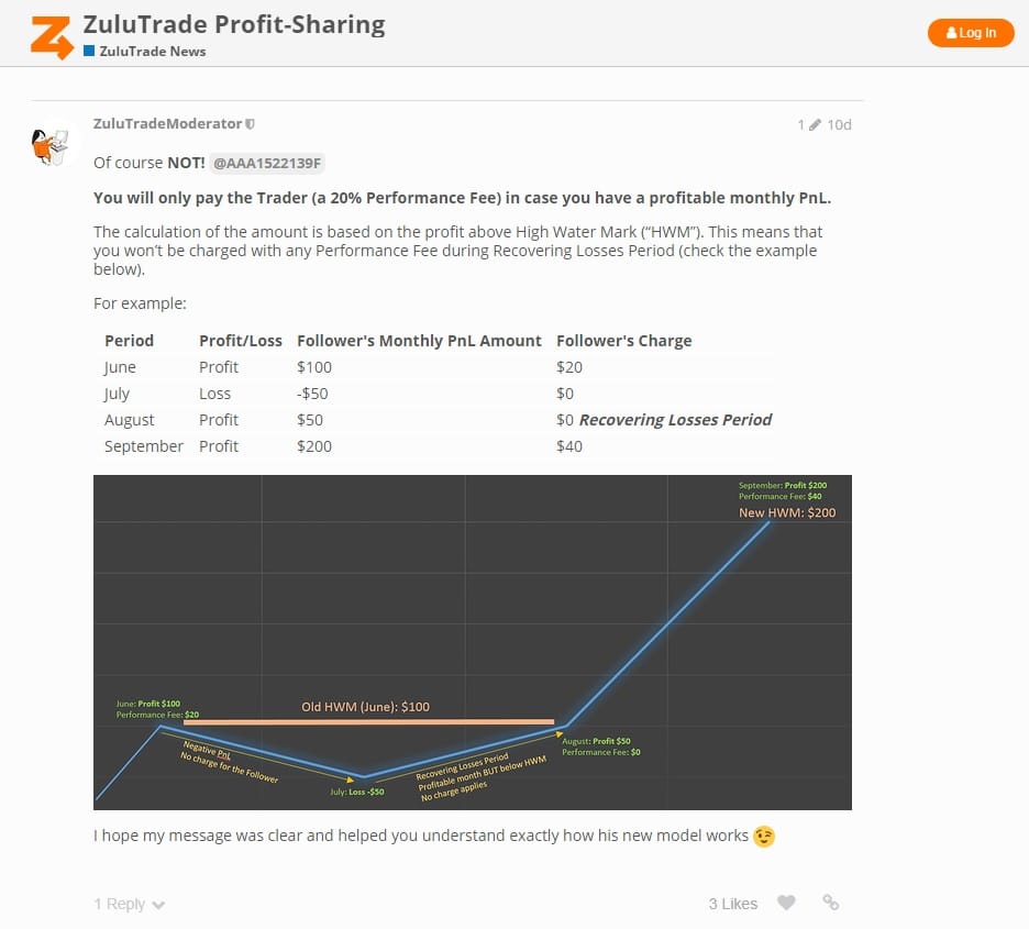 ZuluTrade beabsichtigt in 2018 ein Profitshare Modell mit High Watermark. Die Performance Fee soll bei 20% liegen und für Follower geringere Handelskosten beinhalten