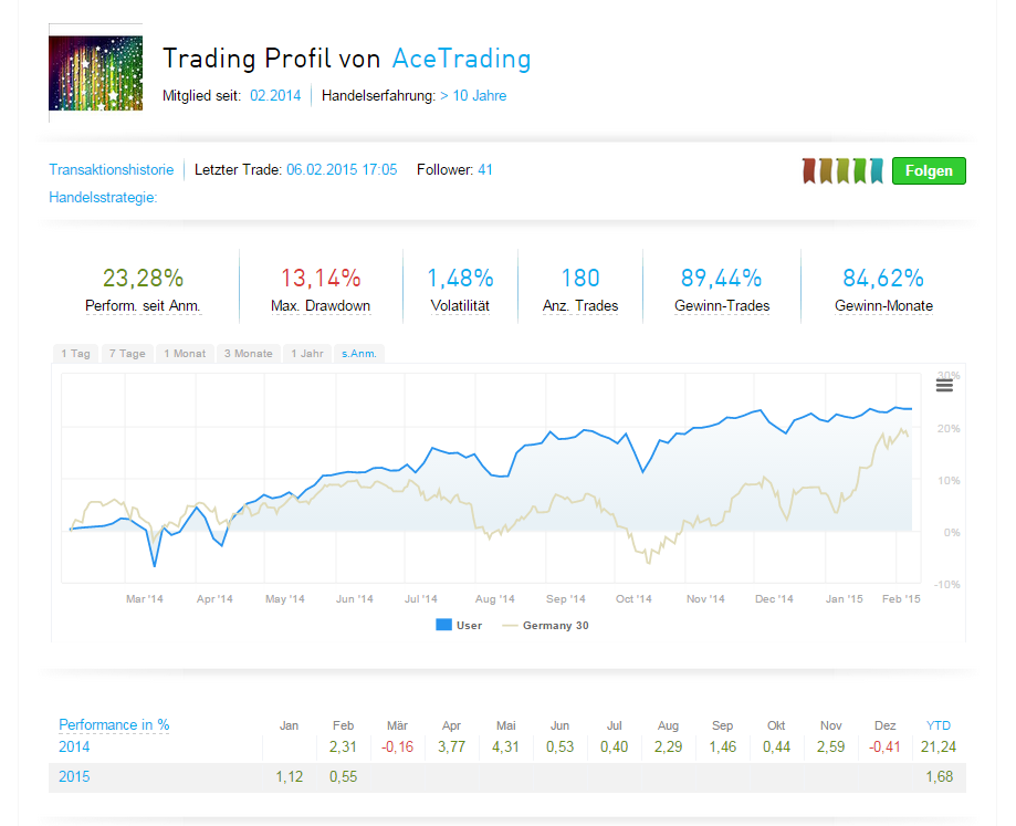 Beachtung verdient u.a. das Trading Profil von AceTrading.