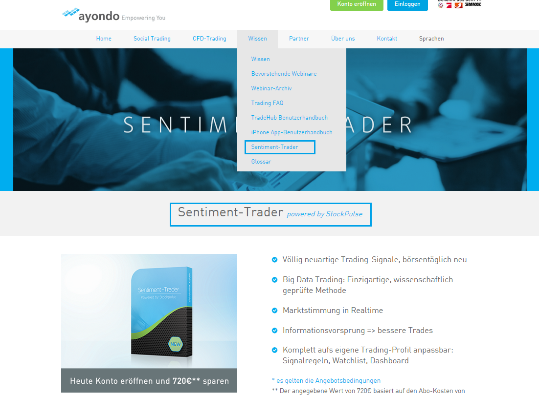 Seit einigen Wochen hat ayondo den Service von Stock Pulse unter dem Namen Sentiment- Trader implementiert und unterstützt die interessierten CFD-Kunden von ayondo mit einem Aktionsangebot.