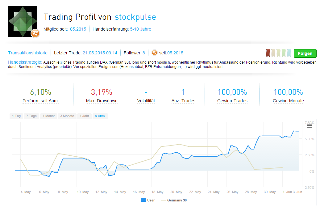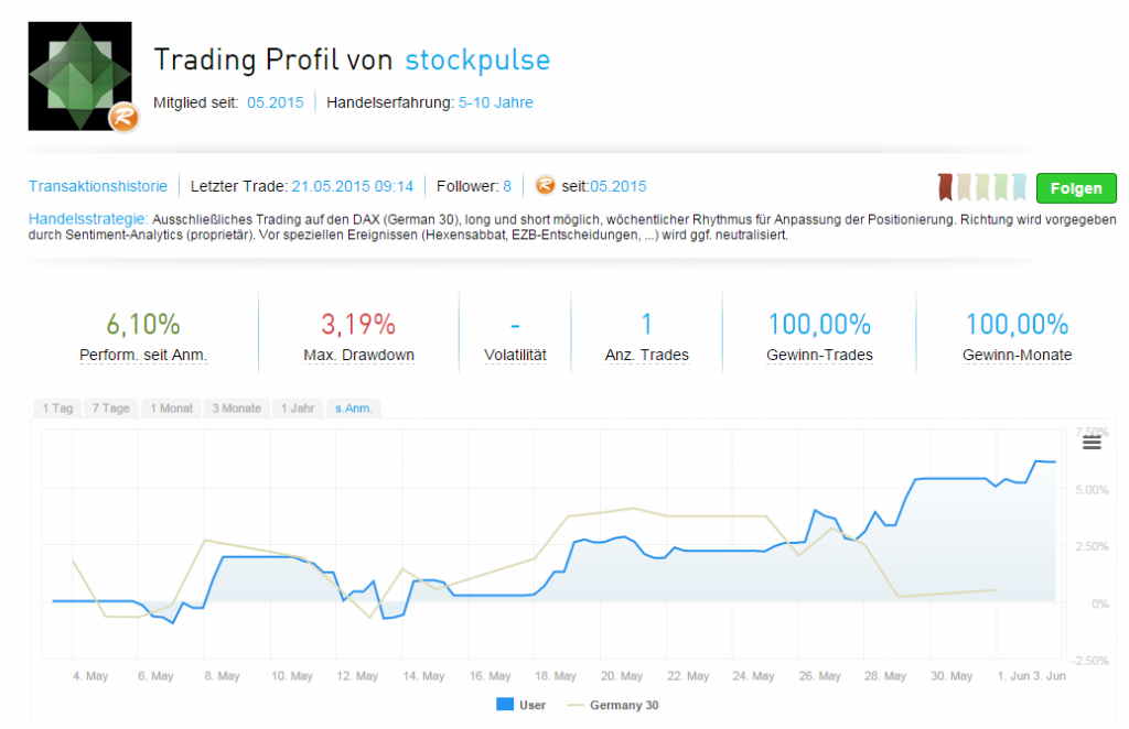 Im Gegensatz zum Profil von HPMStefanRisse konzentriert sich StockPulse in der Strategie auf den Deutschen Aktienindex und führt hierzu aus: