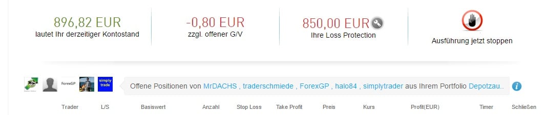 Die anderen 4 Top Trader, MrDACHS, smplytrader, Traderschmiede und ForexGP konnten die Wochenperformance auch bisher nicht retten. Das Depot steht bei ca. 896 Euro.