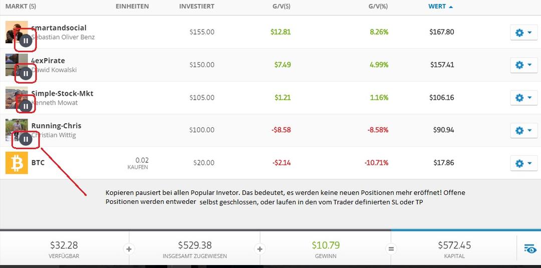 Als Vorsichtsmaßnahme für das britische Referendum hab ich heute bei allen Popular Investors das Kopieren pausiert. Dies bedeutet, das keine neuen Positionen mehr kopiert werden. Die bestehenden Positionen werden entweder per Stop Loss oder Take Profit geschlossen, oder ich schließe sie selbst.