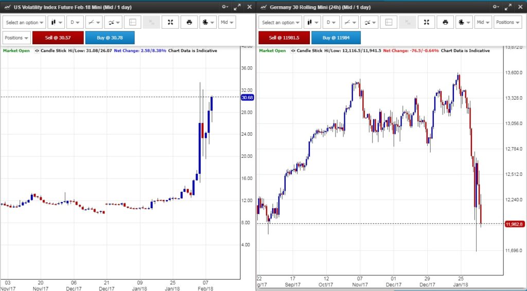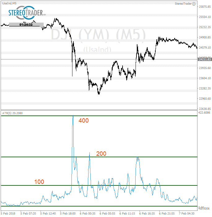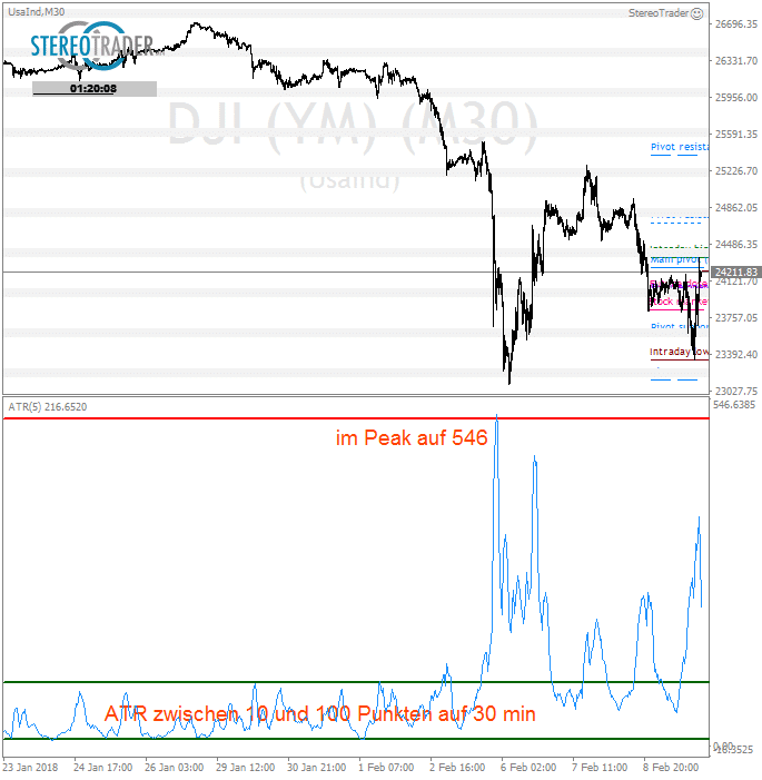 Die beiden folgenden Screenshots verdeutlichen die veränderte Situation für alle kurzfristig orientierten Händler. Im ersten Bild ein 30 Minuten CFD Chart auf den Dow. Im unteren Chartfenster ist die Average True Range über die letzten 5 Perioden eingeblendet. Die ATR stellt die geglättete Schwankungsbreite über x Perioden dar und ist recht hilfreich bei der Stoppfindung. Bewegte sich also der Index noch Ende Januar im 30 min Chart in einer Spannbreite von 10 bis 100 Punkten, knallte es in den letzten Tagen auf bis zu 546 Punkten. Was man sonst in Monaten absolvierte, war also bereits nach einem Frühstück gegessen…