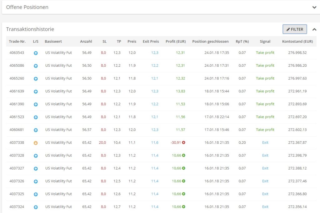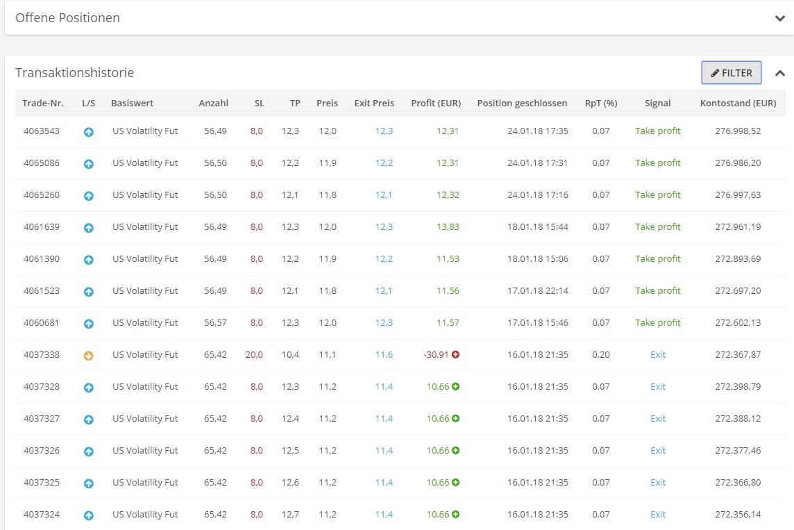 Zum Profil EdleMetalle noch ein Hinweis, der in gewisser Weise auch eine Tragik in sich birgt. Der Händler war bis Ende Januar regelmäßig long im US Volatility Future. Die Positionen konnten stets mit einem kleinen Plus geschlossen werden. Die dahinter stehende Handelsidee war durchaus richtig. Nur gerade dann, als diese Positionen seine laufenden Indexlongpositionen gerettet hätten…waren sie nicht mehr da, siehe Chart oben. Die letzte Transaktion erfolgte am 24.01.2017. Nur 7 Handelstage später wären seine Vola Longs explodiert…