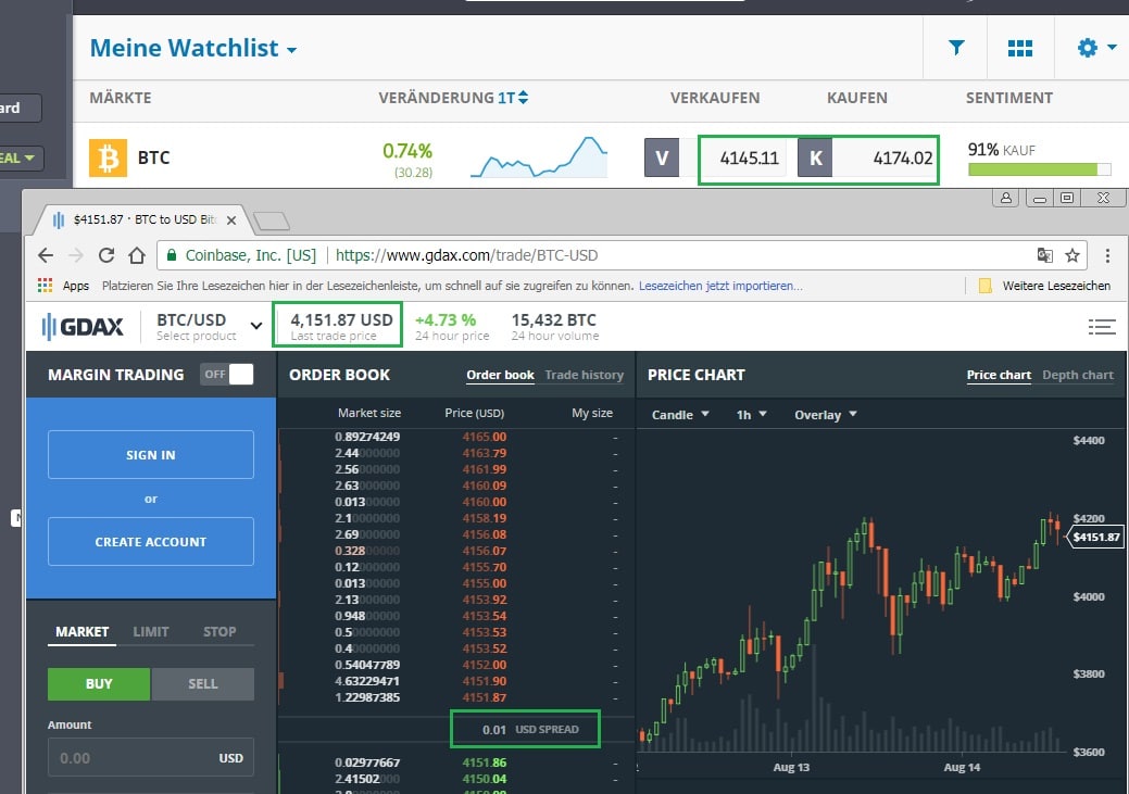 Dazu einmal ein kleiner Screenshot der die zeitgleiche Quotierung von Bitcoin in USD auf GDAX von Coinbase und den CFD’s von eToro zeigt.