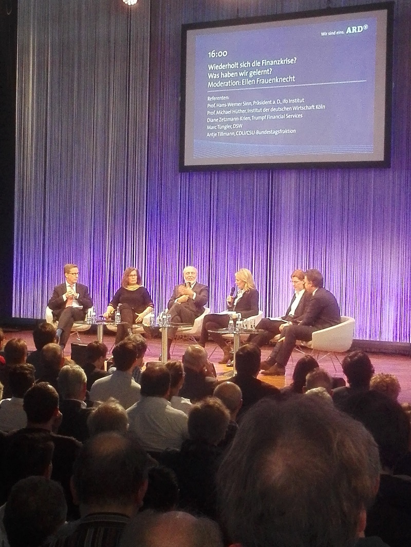 Große Themen bestimmten die Podiumsdiskussionen der ARD Bühne. Rappelvoll lauschte man den Argumenten der Teilnehmer, u.a. Hans-Werner Sinn, Michael Hüther, Marc Tüngler und diversen Vertretern der Politik, u.a. aus FDP und CDU.