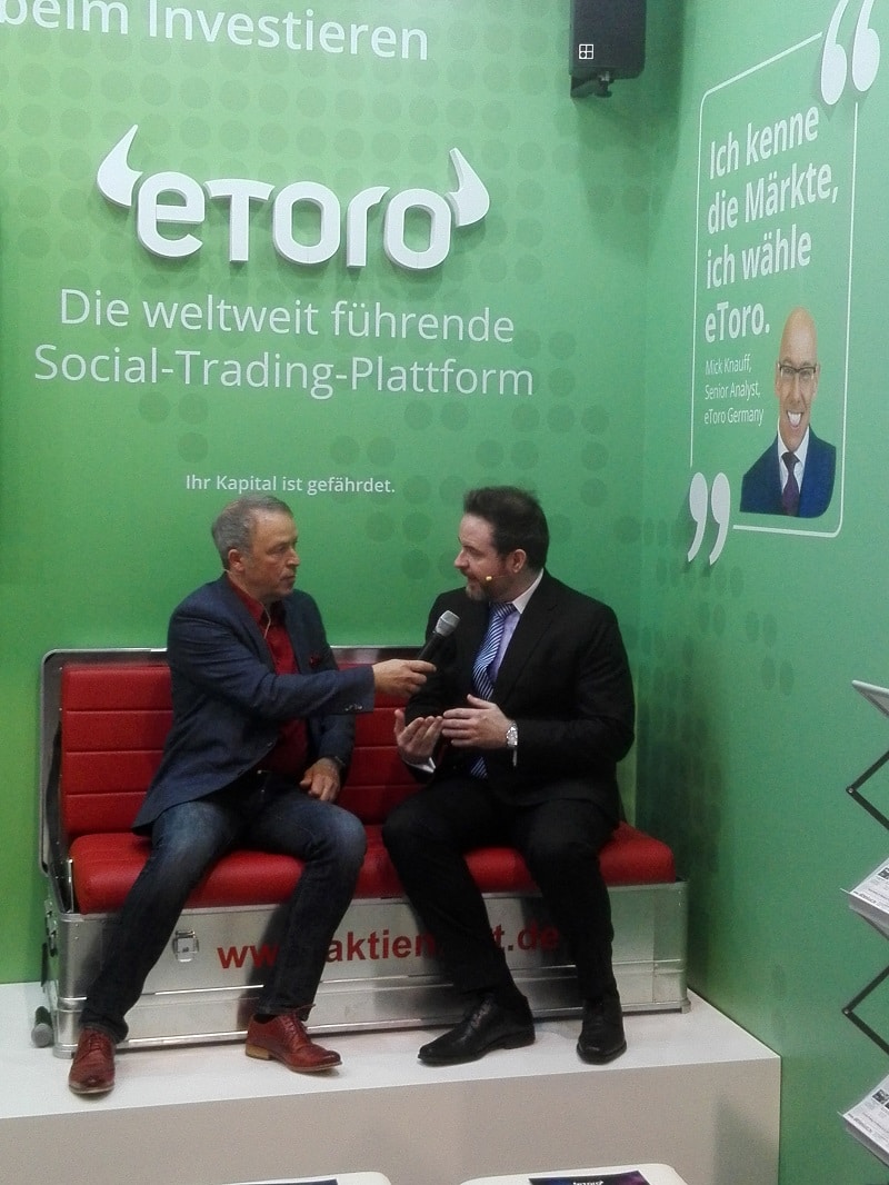 Genau um diese drehte sich auch ein kleines Interview am Stand von eToro. Der Marktführer des CFD-basierten Copytradings bestritt sein Programm in Kooperation mit aktienlust.tv und holte die Interviewpartner auf die rote Couch. Fazit der Herren im Foto, Trading ja, Investment…naja. So gehen die Meinungen also auch hier nicht nur in eine Richtung.