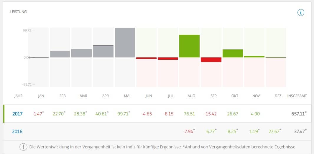 Wer es nicht bei Einzelinvestments belassen will, kann auf den Crypto CopyPortfolio zurück greifen. Über 41.000 Follower und 578 Investoren zeugen von dem regen Interesse auf eToro. Einstiegshürde hier sind weiterhin 5.000 Dollar. Schaut auf die simulierte und seit Juni 2017 real erzielte Performance des Konstruktes, können sich Anleger über mangelnde Vola nicht beklagen. Bisher ist dem Projekt Erfolg beschieden.