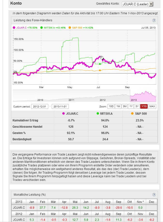 Die Einzelergebnisse zeigen doch eine deutliche Differenz von Top zu Flop. Der Mittelwert liegt bei 6,21 %. Da es sich hier ausschließlich um Devisenportfolios handelt, ist mir der Vergleich mit dem S&P500 nicht ganz nachvollziehbar. Wie auch immer. Die Trade Leader Ergebnisse zumindest im laufenden Jahr sind für die Mehrzahl der vom Aktienbullenmarkt getriebenen Investoren sicher eine Enttäuschung. Aber so ist es nun einmal mit den Äpfeln und den Birnen. Bei currensee werden currencies gehandelt und nicht Dow, Dax, Gold und Öl. Mit diesem Kompetenzvorteil sollte currensee eigentlich ein Pfund im Vergleich zu den anderen „Gemischtwarenläden“ haben, die auch CFD’s – auf der Himmel wer weiß nicht alles – anbieten. Offenbar hatte es currensee aber nicht geschafft, mit diesem Pfund und einer fairen Vergütung bei Tradern und Investoren zu punkten. Im Ergebnis schlüpft man nun in das Nest von OANDA, übrigens auch ein Pionier – ein Forexpionier…Bleibt zu hoffen, dass aus zwei im Grunde guten Ideen, eine noch bessere folgt.