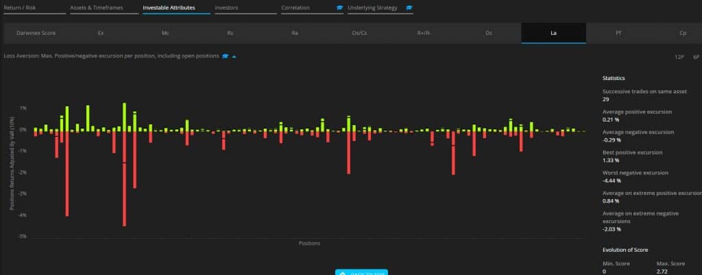 “Loss Aversion” measures if the underlying strategy’s behaviour is symmetrical in case of winning vs. losing positions. A low score means the trader tends let losing positions run longer than winning ones.