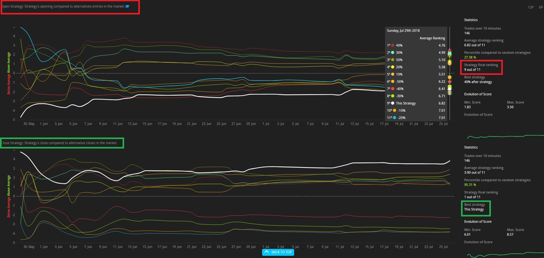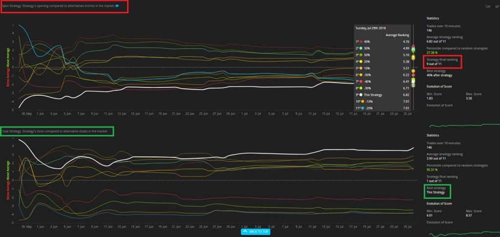 “Open Strategy” measures if the strategy would perform better by systematically opening trades earlier / later. The higher the score, the better the trader’s decisions to enter the market.