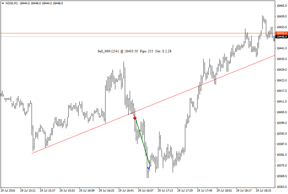 Nun war ich natürlich auch interessiert zu sehen, wer mich kopiert und vor allem auch was. Also nahm ich mir die Historie unter die Lupe und die 4 Profile, die meinen Shorttrade im Dow vom Freitag mitgehandelt hatten. Ich muss gestehen, ich hatte einen Sell Stop im Markt und den Trade auf dem Heimweg in der S-Bahn mobil geschlossen. In MT4 sah der Trade so aus: