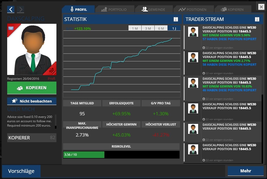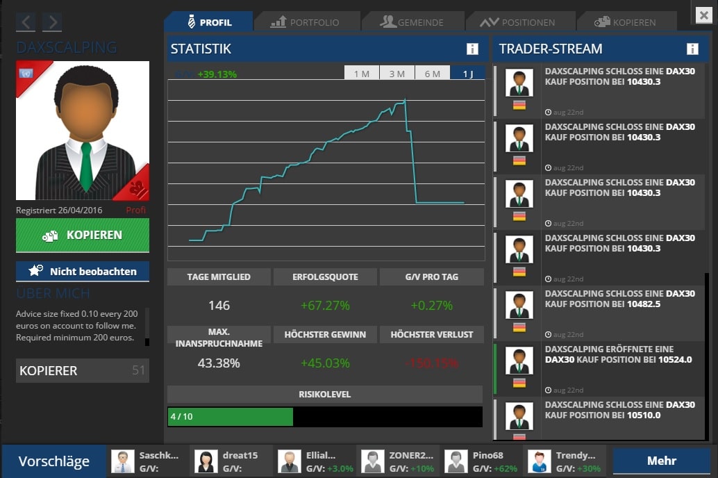 Der Trader DAXSCALPING hat aktuell 81 Kopierer, ist paar Monate dabei und handelt seinen Account ganz ordentlich.