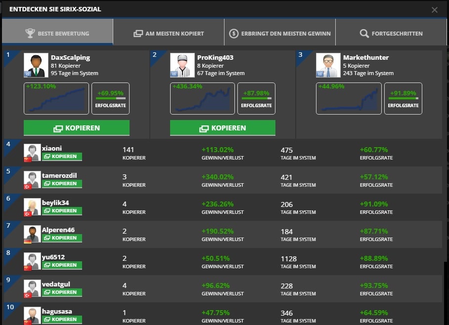 Nun ist Sirix Social Trading für Signalprovider in keinster Weise attraktiv, denn es gibt nichts zu verdienen. Sinn macht es jedoch für interessierte Kopierer, die ohne Gebühren oder Mark Up’s andere Händler der Community verfolgen und auch kopieren können.