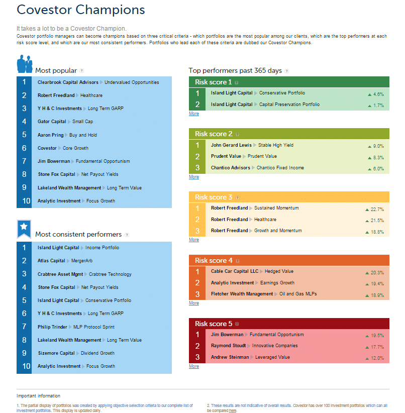 Möchte man sich auf einen Blick zu den populären oder beständigen Strategien informieren, springt man zu den Covestor Champions. Hier findet man in den unterschiedlichen Risiko Score Stufen empfehlenswerte Portfolios.