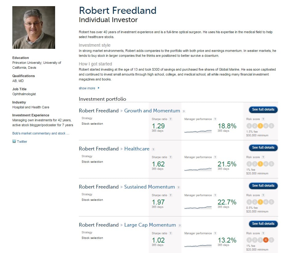 Auf der Plattform agieren sowohl institutionelle Finanzdienstleister, als auch private Investoren, die ihre Strategien der Öffentlich zugänglich machen. Beispielhaft im Screen ein Händler, der 4 unterschiedlich ausgerichtete Portfolios als Trader anbietet. Die im Profil ausgewiesene Fee wird 50 zu 50 geteilt zwischen Covestor und dem Strategieanbieter.