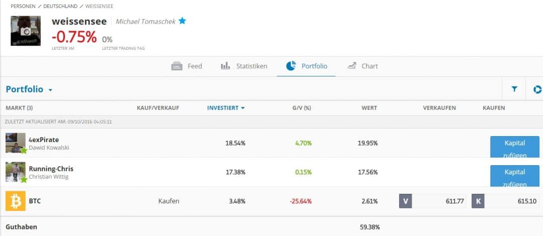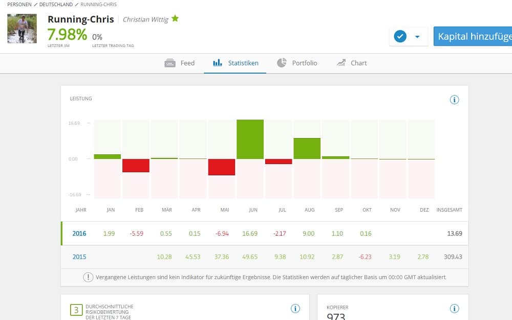 Nach einiger Suche im eToro Universum habe ich mich nun entschieden Christian Wittig, aka RunningChris erneut in mein Depot zu hieven. Christian hat nach einigen Monaten nun offenbar wieder Zeit, sich vermehrt um sein eToro Profil zu kümmern.