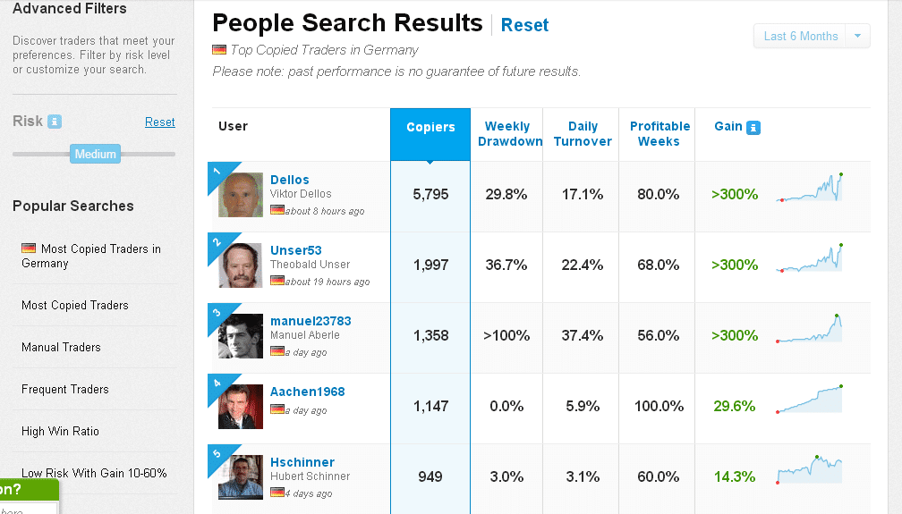 Es gibt Neuigkeiten bei eToro, dem größten Social Investment Network, die jeden suchenden Follower erfreuen werden. Der eine oder andere stellte sich vielleicht die Frage, wie einige Social Gurus auch heute noch eine solch große Kopierergemeinde auf sich vereinen, obwohl sie nicht unbedingt im laufenden Jahr als Trader überzeugen konnten. Nunmehr gewährt eToro tiefere Einblicke und stellt Performancecharts bis zu 3 Jahren rückwirkend zur Verfügung. Ein Blick auf die Charts und die aktuell verbleibende Performance erklärt dann wohl einiges. Ich habe im folgenden Slider beispielhaft einige heute sehr populäre Social Gurus ausgewählt. Namen wie Santoshtiwari, Malsolo, der tradende Brummifahrer hschinner oder auch babczyk sind allen Usern auf eToro ein Begriff. 2 Trader ragen in dieser kleinen Show heraus, beispielhaft als Warnung und Empfehlung.